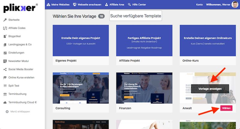 Wähle anschließend eine Vorlage aus und klicke auf den Button „Wählen“ und bestätige im anschließend angezeigten Fenster die Aktion. Nach einigen Sekunden erfolgt die Fertigmeldung und Du kannst wieder ins Dashboard zurückkehren, indem Du in der linken Navigationsleiste auf „Startseite“ klickst.