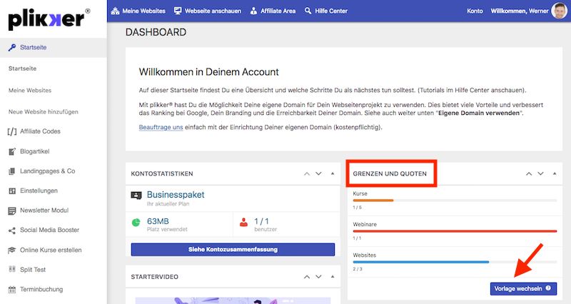 Falls Du ein anderes Layout verwenden möchtest, dass besser zu Deinem Webprojekt passt, klicke nach dem Login in Deinem Dashboard im Abschnitt „Grenzen und Quoten“ auf den Button „Layout wechseln„.