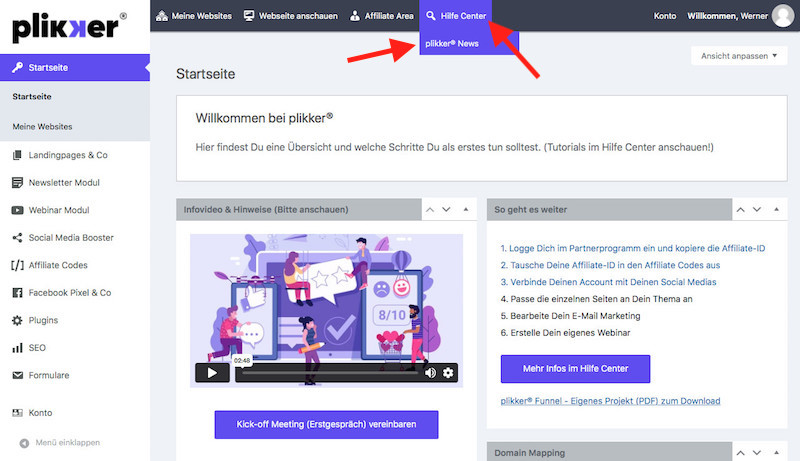 In der Sekundärnavigation am oberen Bildschirmrand, hast Du die Möglichkeit das Hilfe Center für weitere Tutorials aufzurufen. Außerdem kannst Du Neuigkeiten von plikker® erfahren.