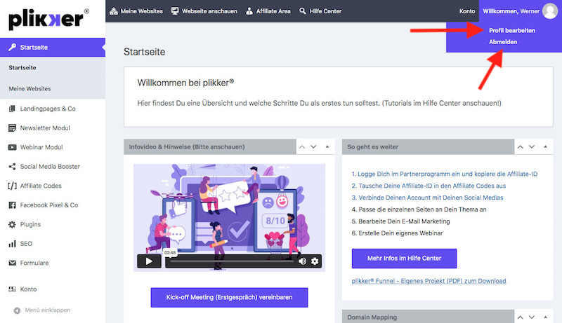 Durch klicken auf „Profil bearbeiten“ kannst Du Infos zu Deinem Profil ergänzen oder ändern. Darunter befindet sich der Abmeldelink aus Deinem plikker® Account.