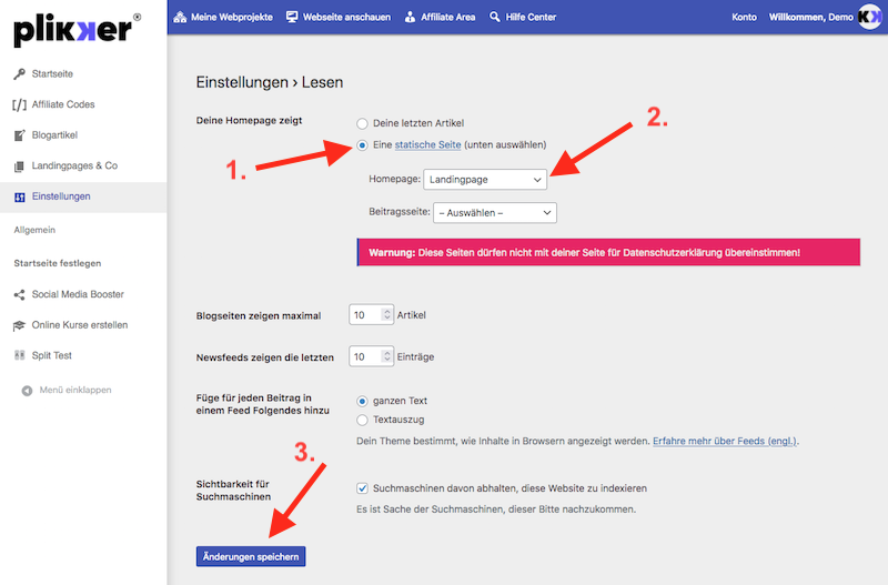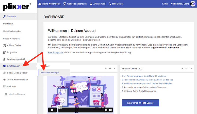 Falls Du eine bestimmte Seite als Homepage (Hauptseite) festlegen möchtest, logge Dich in Deinen plikker® Account ein und klicke auf den mit dem roten Pfeil gekennzeichneten Button „Einstellungen > Startseite festlegen„.